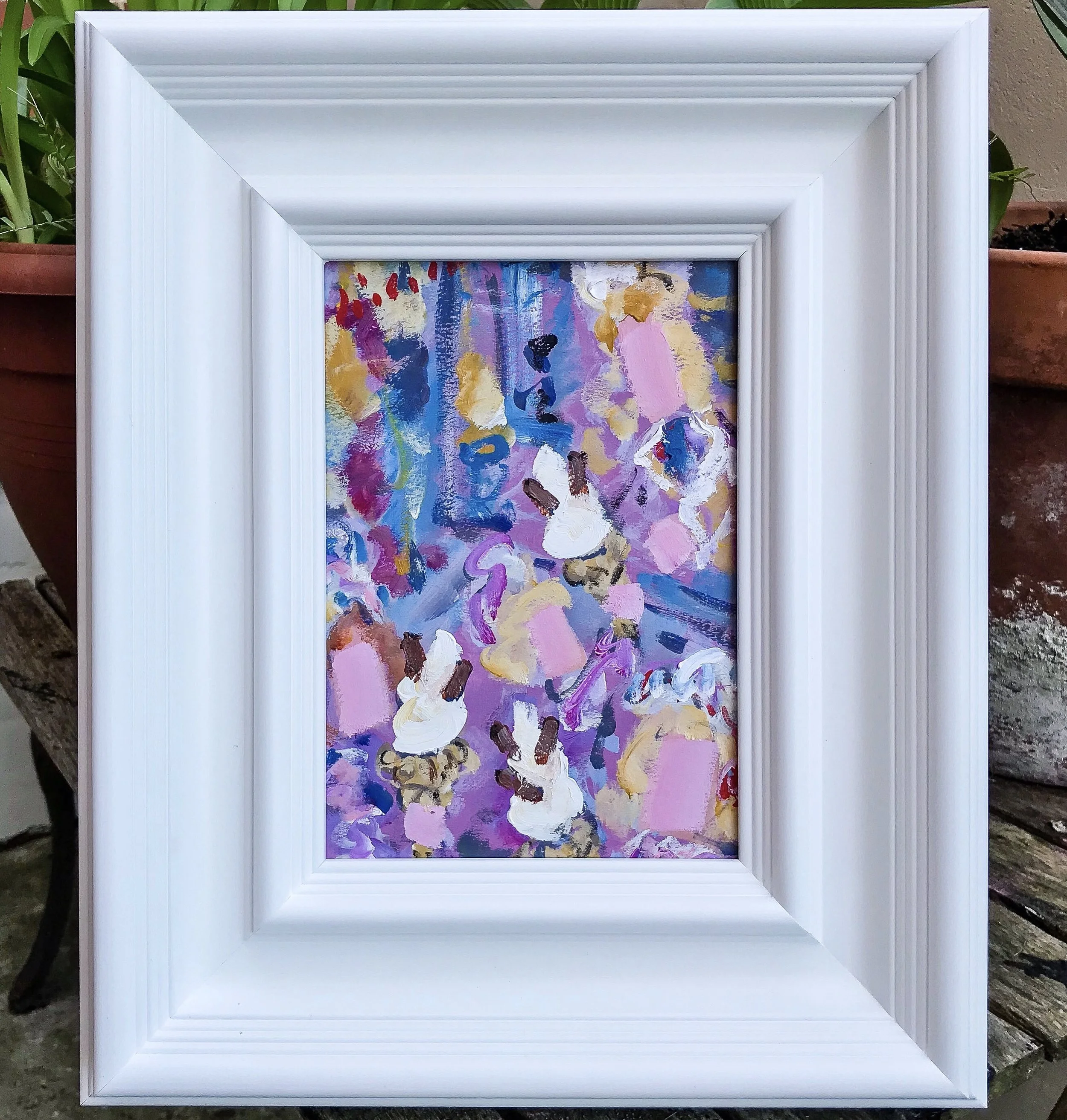 I like to deliver my art ready to hang, this usually means framed like above; a solid wood gallery frame in a satin white finish ready to hang. After much experimenting I believe this type of framing compliments both my work and most interiors. However, as framing is a matter of personal taste I’m happy to sell work unframed too.